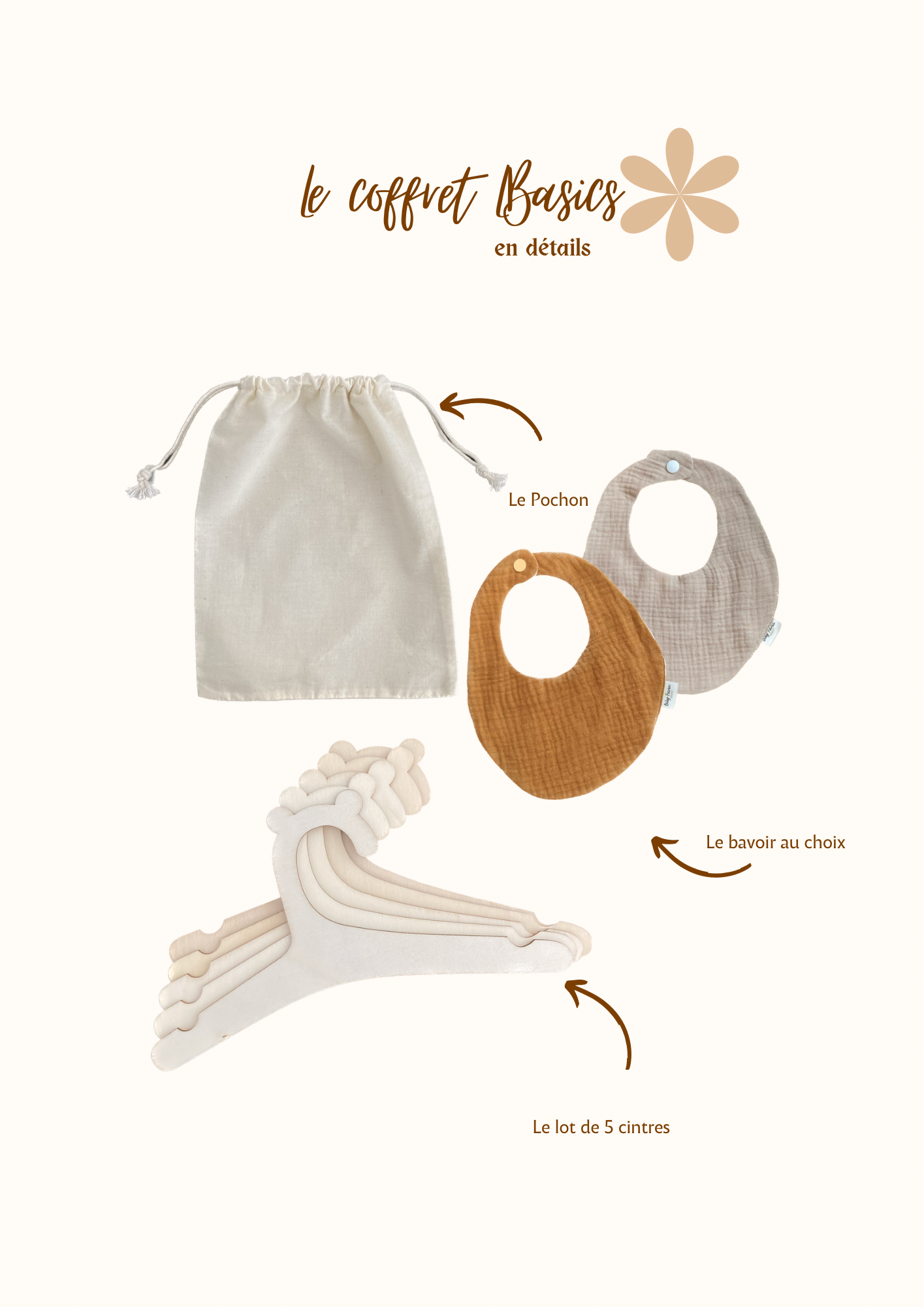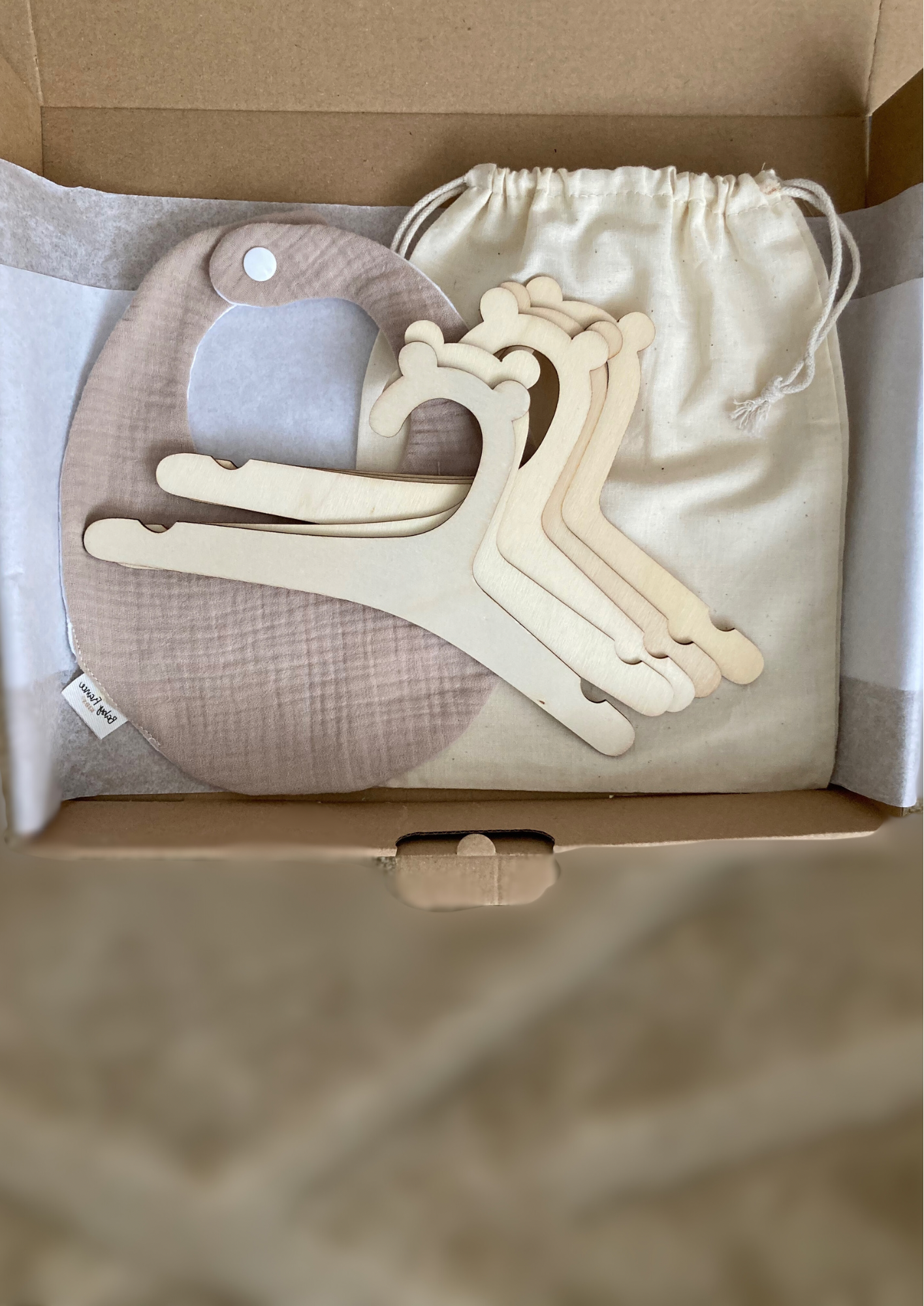 Coffret cadeau pour Bébé composé d’un pochon, d’un lot de 5 cintres en bois et d’un bavoir en gaze de coton.