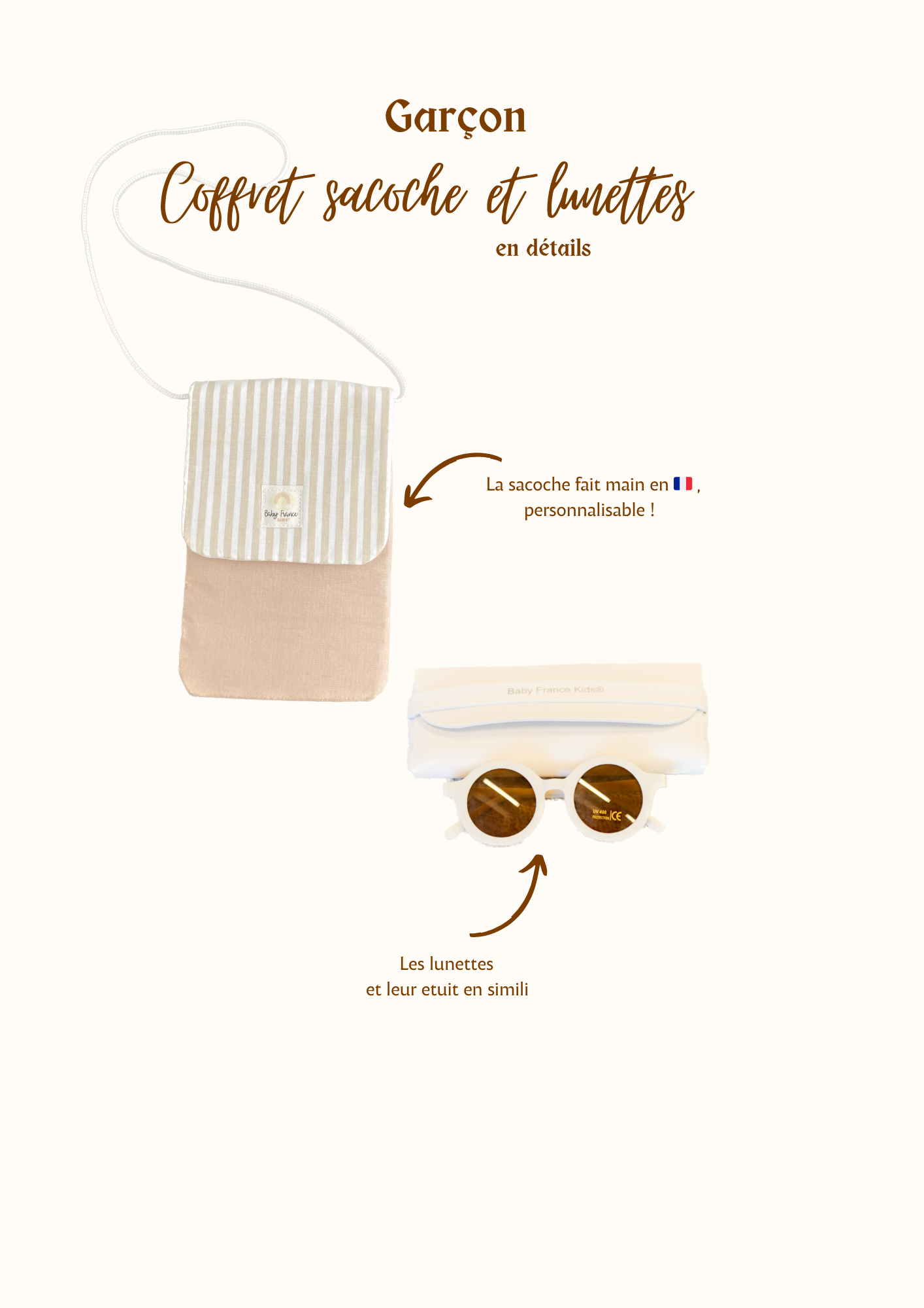 La box été pour enfant est composée d'une paire de lunettes de couleur CAMEL et d'une sacoche fait main fabriquée en France. Cette box est parfaite pour les enfants qui aiment être à la mode tout en étant protégés du soleil. Grâce au choix des couleurs mixte, cette box est unisexe, pour filles et garçons